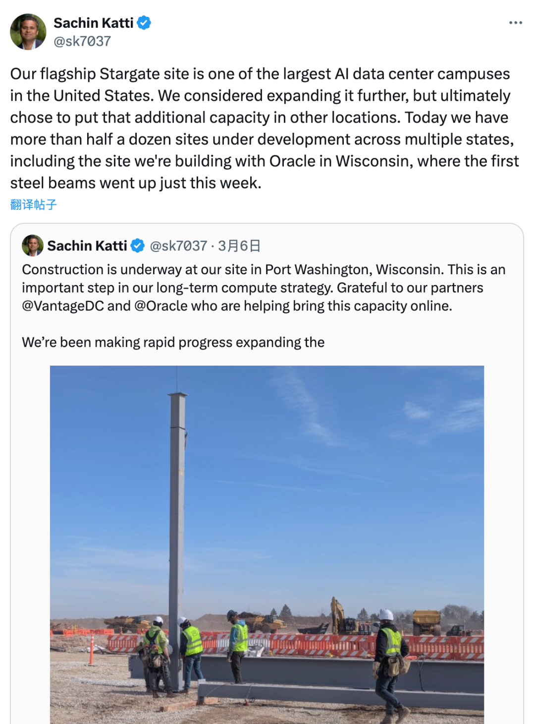 元股证券:yy6699.vipOpenAI 基础设施高管 Sachin Katti 在社交媒体上写道:“Stargate的旗舰项目是美国最大的 AI 数据中心园区之一。我们曾考虑进一步扩展,但最终选择将额外容量转移到其他地点。”